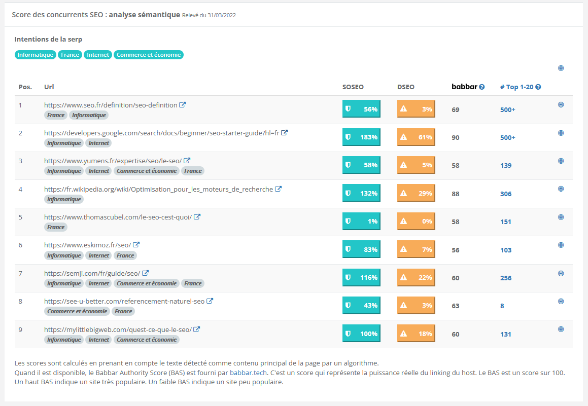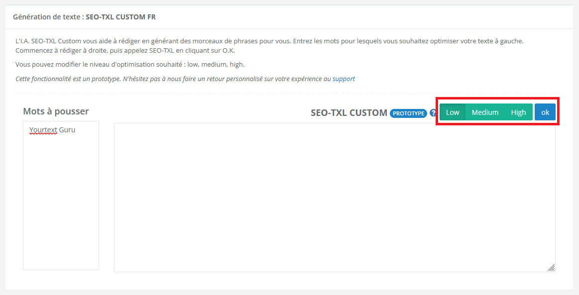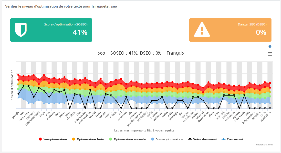 YourTextGuru analyse le champ sémantique des pages les mieux positionnées sur votre requête cible et identifie les termes et expressions à intégrer dans votre contenu principal. L'outil calcule un score de danger qui indique si votre texte est suffisamment riche et pertinent. Il vous guide dans l'optimisation sémantique sans tomber dans la sur-optimisation, en respectant un équilibre naturel entre les différents concepts abordés dans votre contenu.